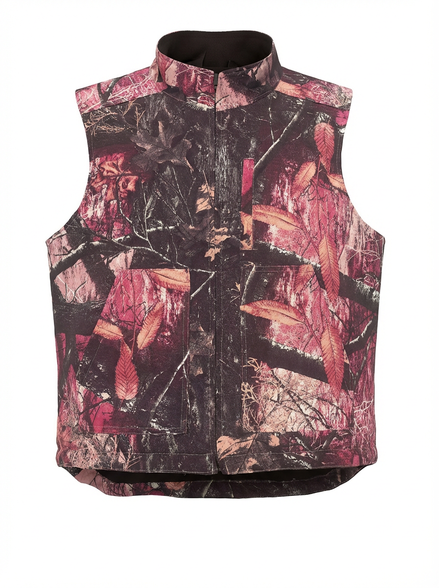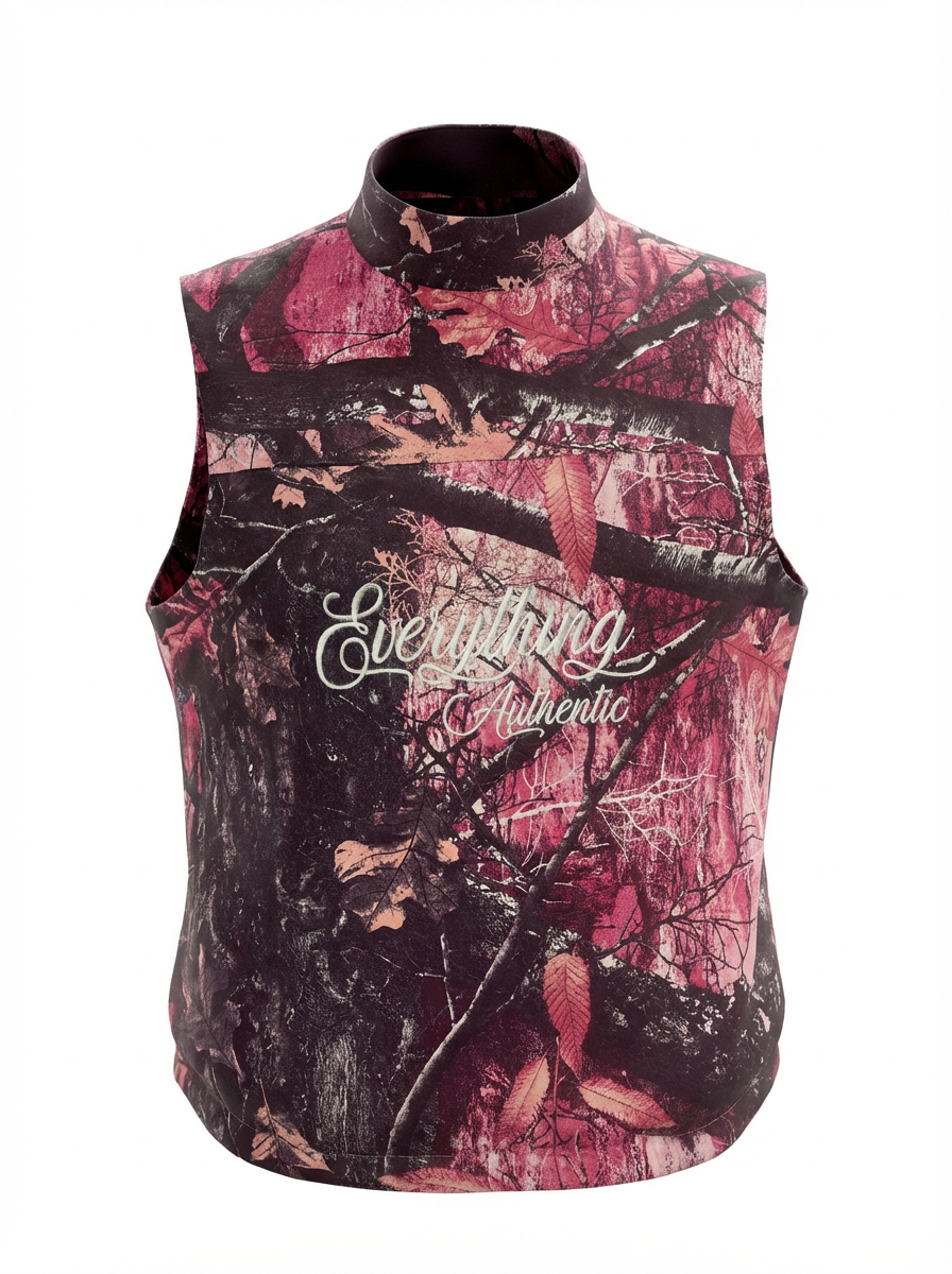 The Everything Authentic Pink Vest features a pink camouflage exterior paired with a plush black interior. This design offers effective insulation while maintaining a lightweight structure, promoting both comfort and functionality in various outdoor settings. Ideal for cooler climates, it combines style with practical warmth.